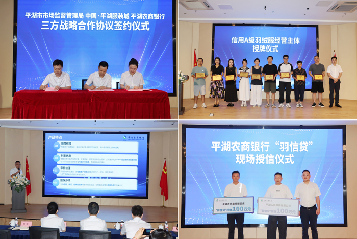 2025年9月2日下午,平湖市市场监督管理局、平湖农商银行与平湖·中国服装城在中国服装城举行战略合作协议启动会,共同推出基于经营主体信用的“羽信贷”金融产品,为信用优良的羽绒服经营主体提供最高500万元的无抵押信用贷款,开创了“政银商”三方协同服务小微企业和个体工商户的新模式。