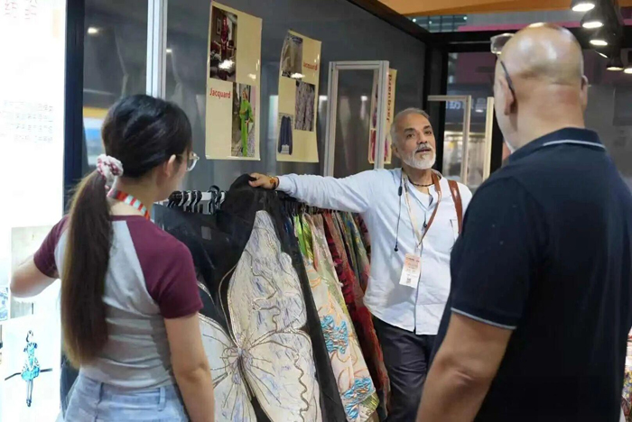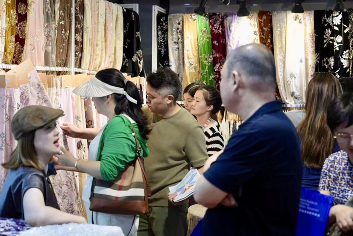 展区占地面积330平方米,集结了腾侠纺织、劦鑫针纺、欧冠纺织等13家柯桥优质面料企业,展出天丝、铜氨、TR等时尚面料以及刺绣、3D印花等后工艺面料4000余款,为采购商提供多元化面料解决方案。其中,鑫华纺织展位聚集了众多采购商,其展出的多色刺绣融合国风元素,以小众差异化风格深受设计师青睐;万纤纺织的天丝醋酸面料手感顺滑、纹理独特,前来询价调样的采购商络绎不绝。展会现场还配套视频号直播、图片直播等线上融合推广,多渠道彰显纺城面料品质。此次组团参展企业共斩获意向订单超20个,收到寄样需求2000余个。