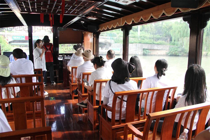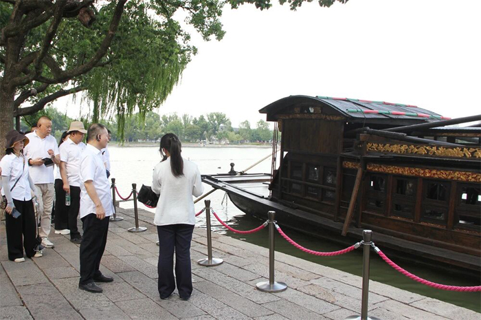 南湖红船,是中国共产党诞生的摇篮,是中国革命的启航之地。在碧波荡漾的南湖上,全体人员怀着无比崇敬的心情瞻仰了中共一大纪念船——红船。