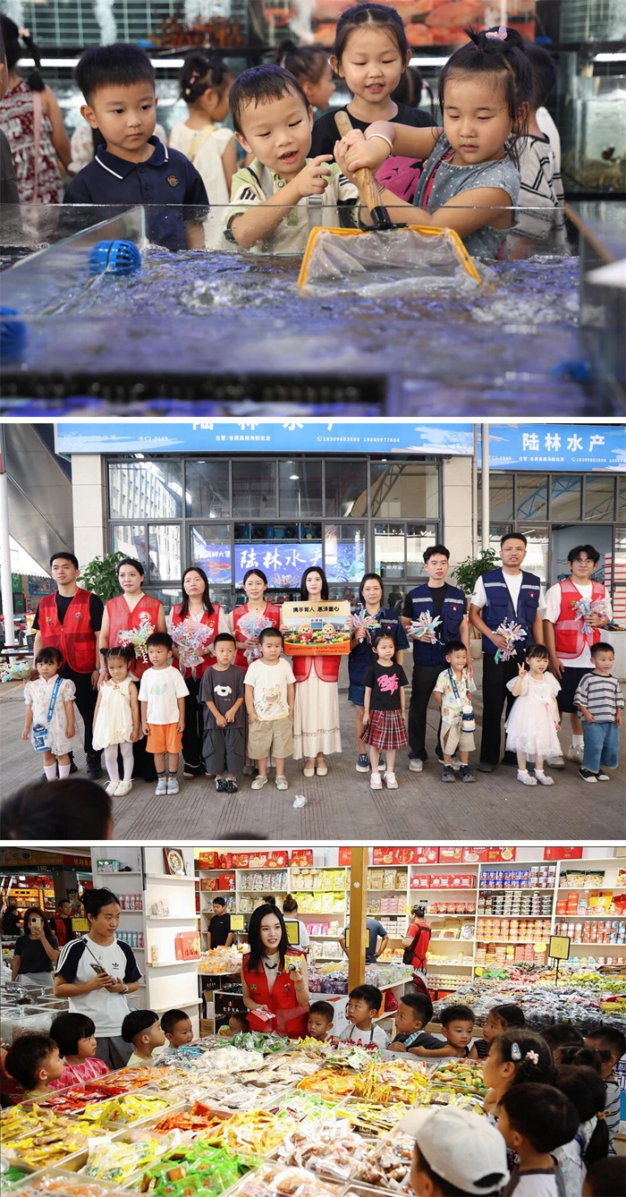 小朋友们跟着农港城志愿者的脚步,先后参观了副食品市场、水果市场和新开业的水产市场交易区,一路边看边问,认识了众多农副产品、海鲜水产的种类与形态,了解了它们从产地到市民餐桌的流通旅程,现场欢声笑语不断。