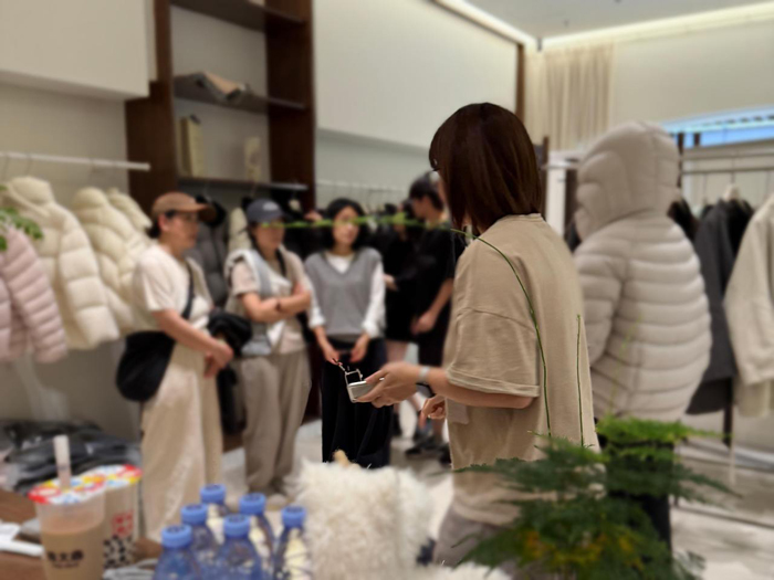 10月19日下午,平湖·中国服装城3楼的“打嗝小狗”档口内,采购商们正用手“阅读”着一件不像羽绒服的羽绒服。负责人官翊勋手持米色绗线外套向围观的客户介绍:“这是我们新出的‘排骨款’,绗线密集,绒不易下沉、分布均匀,而且更轻更薄,搭配大衣也不显臃肿。”她话音未落,已有顾客仔细翻看内衬、按压绒感,当场签下50余件订单。