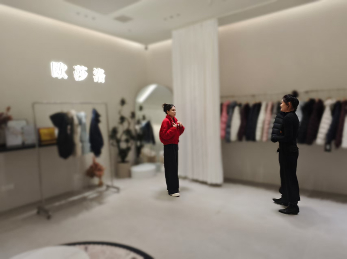 对于保暖性能,她补充:“关键在充绒量、蓬松度和绒子含量。我们通过溯源码和提供质检报告,让采购商买得放心,顾客穿得时髦,保暖不打折。”