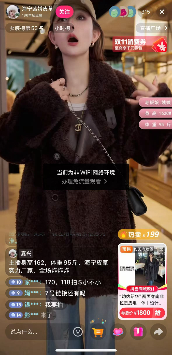 “里外都是纯皮毛,一件抵两件穿,趁着双十一赶紧入手!”董思流畅地翻转着衣服,细致讲解每个细节。她的直播间背后,200多平米的店铺货架上挂满了各式皮衣,当天要推介的新款就有十几件。