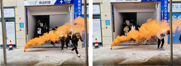 随着“警报声”响起,消防安全应急疏散演练正式开始。大家用袖子、手帕捂着口鼻,弯着腰,有序的从安全通道撤离。到达安全区域后,工作人员立刻清点人数并及时上报。