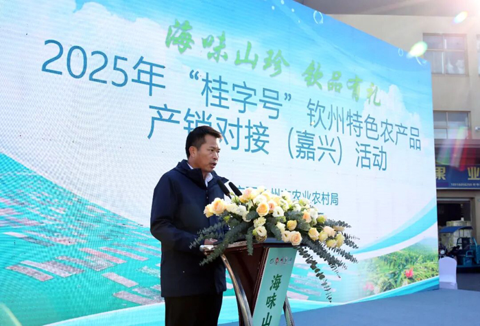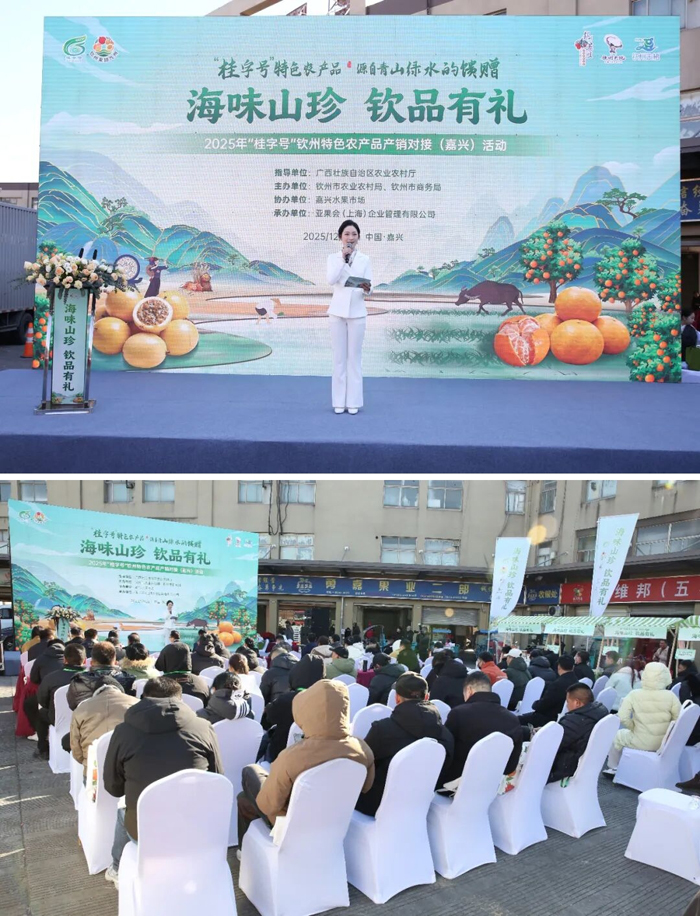 12月26日,“海味山珍 钦品有礼”2025年“桂字号”钦州特色农产品产销对接(嘉兴)活动在嘉兴水果市场举行。钦州市委农办主任、钦州市农业农村局党组书记、局长韦戴卓,钦州市商务局党组书记何倪,嘉兴水果市场总经理助理、服务中心主任黄晶照,广西壮族自治区水果站市场科副科长梁秋瑜,钦州市农业农村局党组成员、副局长黄海斌,钦州市水果发展中心主任邓善能等参加活动。