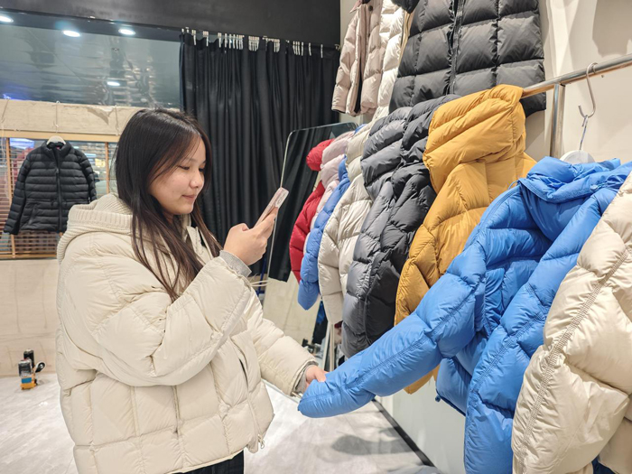 中午12时,市场各楼层依旧人声鼎沸。在平湖羽绒服市场的三楼原创区,“悦莱”档口内一派繁忙:导购在货架间快速打包,收银台前挤满了询价的顾客,不少消费者举着手机,对心仪的款式拍摄、比对、分享。