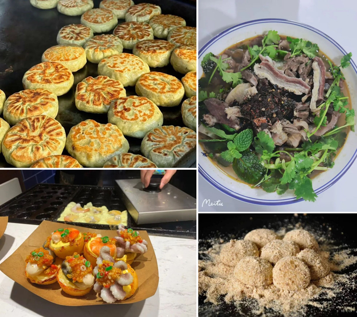 一碗热羹下肚,身子暖了,逛年货市场的兴致也彻底被点燃。接下来,才是真正的好戏开场。不仅有那香气扑鼻、热气腾腾的猪三腑,用新鲜的猪肉和内脏精心熬煮,汤底醇厚浓郁,每一口都饱含着乡野的质朴与温暖;还备有琳琅满目的各式特色美食,等待食客们细细品尝。比如那炸得金黄酥脆的响铃卷,咬下去“咔嚓”作响,豆香满溢;软糯弹牙的蒸团,外皮晶莹,内馅或甜或咸,带来满满的饱足感;鲜醇的牛血汤,滑嫩的血块搭配清润的汤头,暖胃又滋补;香甜软糯的麻糍,裹着细腻的豆粉或红糖,是记忆里最温柔的甜点;酥软可口的番薯糕,带着红薯天然的甘甜与绵密口感;鲜美的蚝蛋烧,将海蛎的肥美与蛋香完美融合,煎得边缘微焦,内里嫩滑;还有那风味独特的角干麦饼,麦香扎实,烘烤后略带焦香,越嚼越有滋味。每一道都是匠心制作,承载着地方的风味与人情,共同组成了一席丰盛而地道的味觉盛宴。