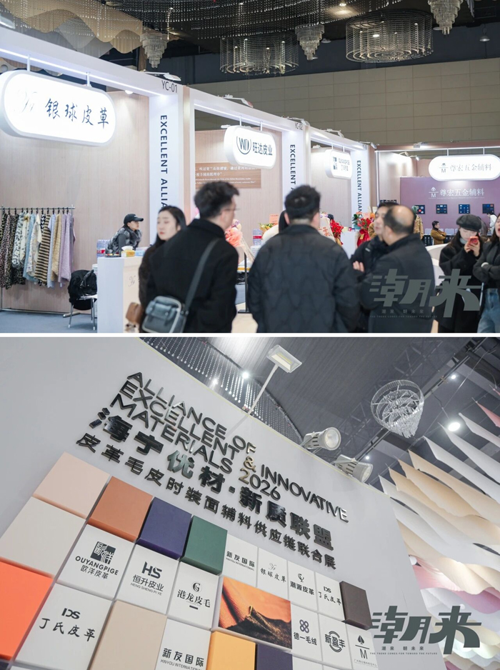 2026海宁优材新质联盟联合展同步亮相。新友国际、银球皮草、潮源皮革、丁氏皮革、港龙皮毛、新盈丰皮革、金亿皮业、恒升皮业、旺达皮业、杰出皮革、尊宏辅料、德一纺织——12家优质联盟企业,以“抱团发展、资源共享、标准共建”的模式,集中展示手工擦蜡油蜡皮、托卡云朵、哈特皮、南非拉贡等高品质核心面辅料产品。在聚合皮革毛皮核心原料的基础上,今年新增五金辅料、时装面料等品类,实现从原料端向全品类的延伸覆盖。