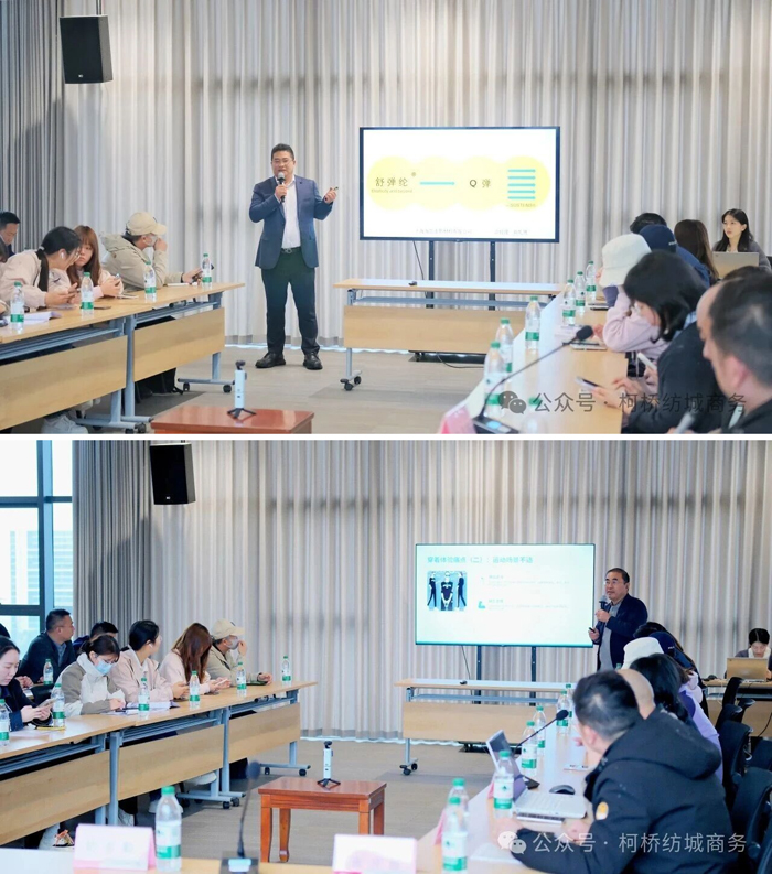 行业交流会上,四位专家从技术解析、成果发布、产业痛点、发展趋势等四个维度进行了分享。浙江省纺织面料设计协会副会长徐海兵指出,弹性面料应该跳出为唯氨纶论的误区,评判弹性面料优劣的核心在于“伸长率”与“回复率”的双重表现;江苏三联新材料股份有限公司开发总监杨兆珍介绍了非氨弹性纤维及MTY®多组分复合纱,强调其持久弹性与易回收优势;上海海凯生物材料有限公司总经理郑扎贤分享了生物基舒弹纶®的3D螺旋结构,能有效解决鼓包、变形等痛点;浙江省纺织面料设计协会秘书长张井波提出,未来弹性服装应实现“静态有型、动态无束,穿着有感、脱下无痕”。各位专家的分享直击行业痛点与发展趋势,让在场的经营户和企业代表对弹性面料的技术创新与市场布局有了更清晰的认知。