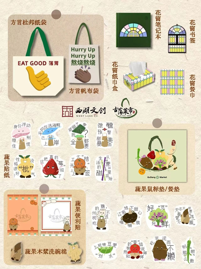 时令蔬果木浆洗碗棉、古荡菜市专属“西施天团”进行拟人化呈现、古荡菜市标志性琉璃窗花笔记本、花窗书签、古荡定制瓷杯,折叠野餐包……个个生动有趣又极具亲和力;这些设计都贴着菜市本身的日常场景走,不刻意、不拔高,旨在让买菜这件事多点趣味,多点记忆。