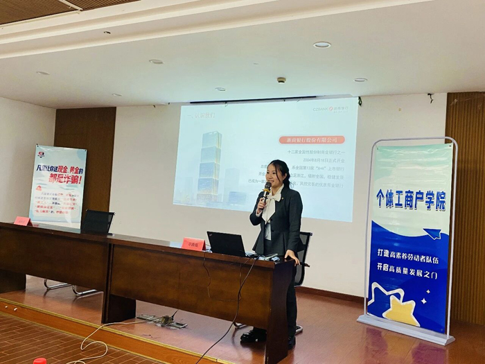 浙商银行台州黄岩支行副经理章薇薇,以《普惠新消费 金融护万家》为主题,解读普惠金融新政策,讲解财政贴息利率优惠,并现场解答商户资金周转、信贷申请等疑问,提供精准金融解决方案,助力商户缓解资金压力、抢抓消费市场新机遇,为商户经营注入金融活水。